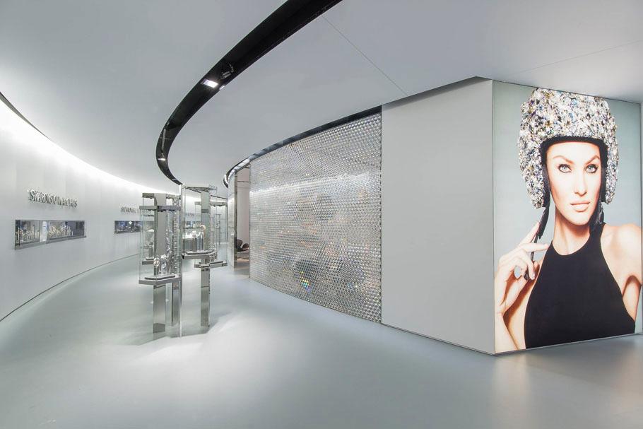 SWAROVSKI展臺(tái)是一個(gè)巨大的圓形展臺(tái),占地兩層,占地2,000平方米,