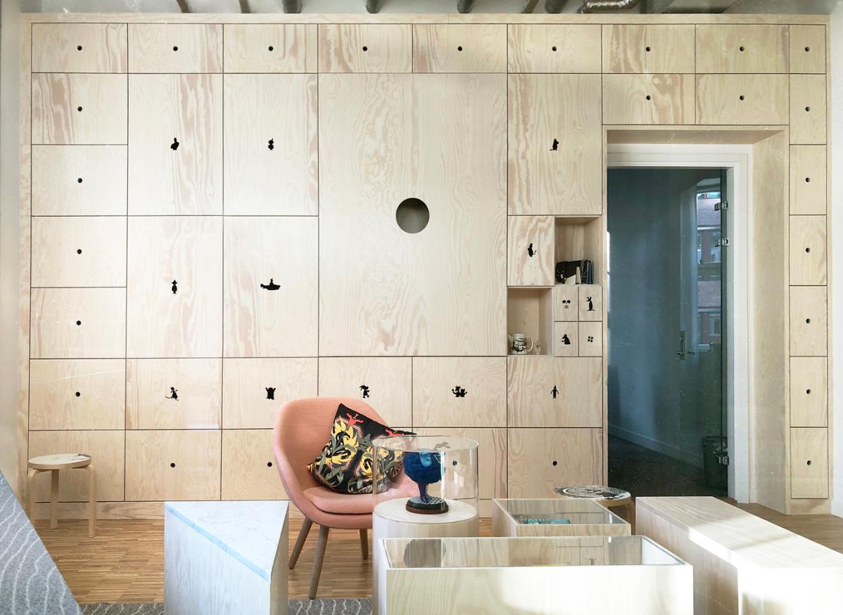 展柜上陳列的物品會因時、因事、因人而易。所有的物品在展柜和置物架上都擁有屬于自己的空間,作為藝術的獨立部分進行展示。所有定制的室內家具都由松木打造,為展品提供斯堪的納維亞特色的背景板。大多數設計品牌最初都是由藝術項目發展起來的,而不是出于商業目的。為了強調這一點,我們選擇將一些精致的圖案藝術結合到建筑當中。一些經典圖案被裁剪成剪影,用作柜門的把手,而其他圖案則被放大成數控壁畫,有的還被放大成一張巨幅的工藝品。