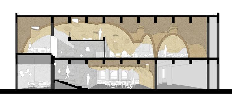 一系列的空間操作構(gòu)成了尋找“窯洞”的過程,由于空間的南北兩側(cè)有致密的片墻,所以我們從片墻之間的空間關(guān)系開始探索。首層空間連續(xù)的筒形拱作為主要空間語言,從建筑內(nèi)部延展到建筑之外,形成了入口處連續(xù)的門廊和波動(dòng)的立面效果;二層空間較高,筒形拱的單一方向性開始減弱,從內(nèi)化網(wǎng)格逐漸演變成一個(gè)空間的疊加穹頂體系,從而形成了最終的“窯洞”空間形態(tài),“天窗”的元素也被用來加強(qiáng)二層大廳中洞穴般的空間體驗(yàn)。