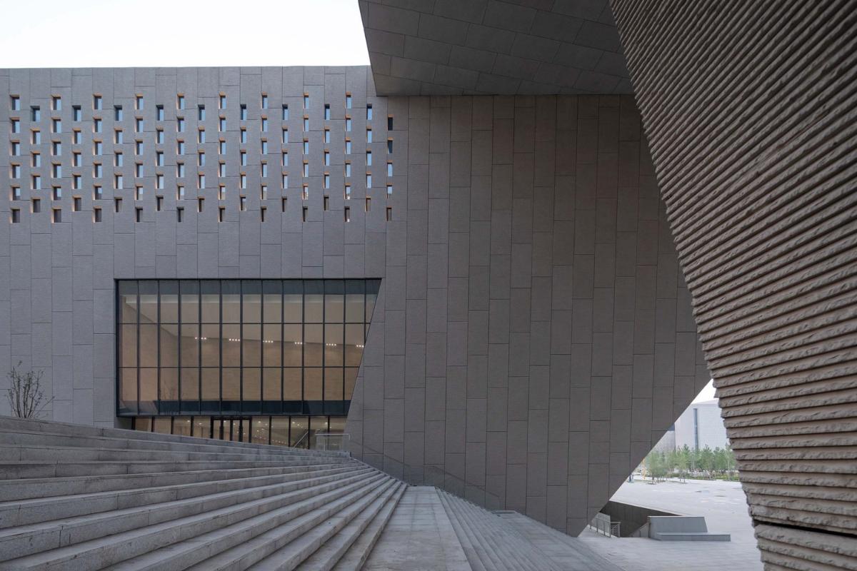 建筑外立面采用暖灰色預制混凝土裝飾板作為立面主材,整體色彩攜帶地域文化元素的基因,但通過當代化的處理提升又呈現出了嶄新的面貌。條紋肌理使得建筑在大尺度的形體之下保持粗糲質感的同時,兼具了近人尺度的細節。立面開窗采用參數化演繹的漸變表皮肌理,取意于河南鞏義石窟中鑿刻過的歷史痕跡,也如青銅器的銘文一般為建筑形體增添精致層次。