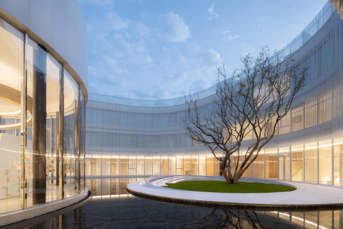建筑靜處江邊一隅,以一種回歸本源的寧靜和柔和,呼應(yīng)著奔流的長江之水。內(nèi)院細(xì)膩的豎向圓桿,勾勒出一片柔和的天空,天光云影隨著時間流轉(zhuǎn),在弧形的半透影墻上緩緩地移動,穿過烏桕樹的枝丫,投下一樹影。感受著時間的寧靜,也感受著時間的流動。