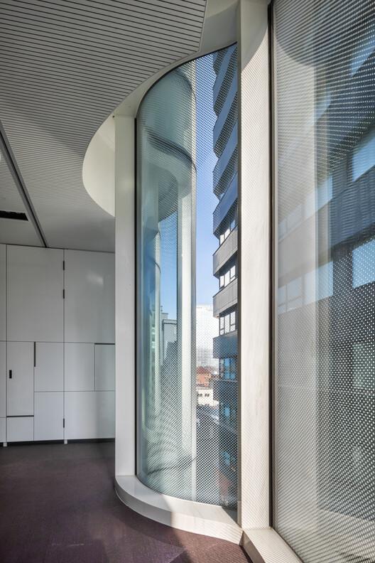 項目的主入口由凹面玻璃墻和鏡面天花板圍合而成,另含長凳與展示櫥窗,好似都市中的一間客廳,邀請人們駐足停留。另一個入口深藏于兩個玻璃盒間,借由幾何形體的連續豎框線條以及高處的波浪立面勾勒出了一個獨立體塊感。建筑師在設計窗簾式波浪立面時,還著重考量了織物的柔軟性與溫度感。