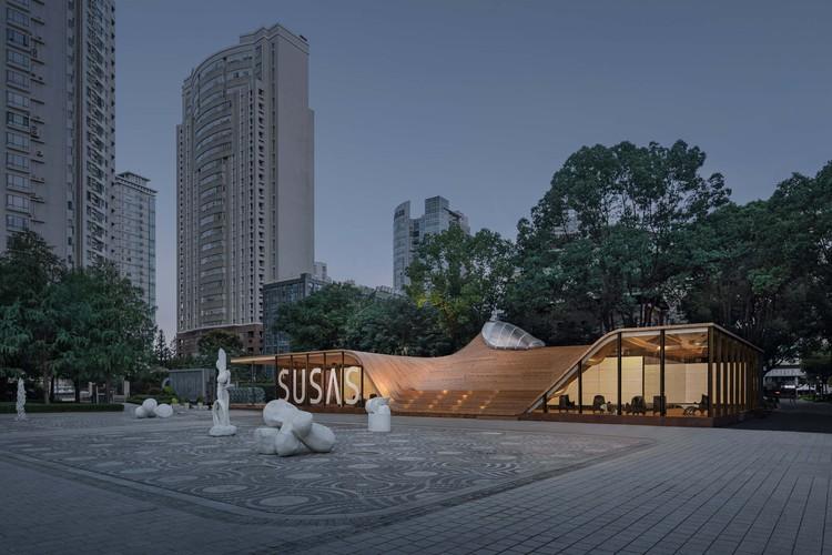 主館取名“共”,利用上生新所停車場的帶狀空間,置入一個(gè)數(shù)字木構(gòu)工藝的拓?fù)淝娼ㄖㄟ^木結(jié)構(gòu)屋面的扭轉(zhuǎn)變形彌合了室內(nèi)外動態(tài)關(guān)系: 曲面頂部開口將天光引入室內(nèi),提供觀展導(dǎo)向的同時(shí),模糊了室內(nèi)外的體驗(yàn);曲面臨廣場一側(cè)下壓變形,在室外提供了座椅看臺,并與對面歷史建筑形成呼應(yīng), 呈現(xiàn)出15分鐘生活圈中城市建筑的公共性與市民性。 主館在建造上采用了機(jī)器人木構(gòu)技術(shù)和機(jī)器人3D打印技術(shù),兩大數(shù)字建造技術(shù)的應(yīng)用即保證了主館異形空間的高質(zhì)量高效完成,又給主館增加不少科技色彩。