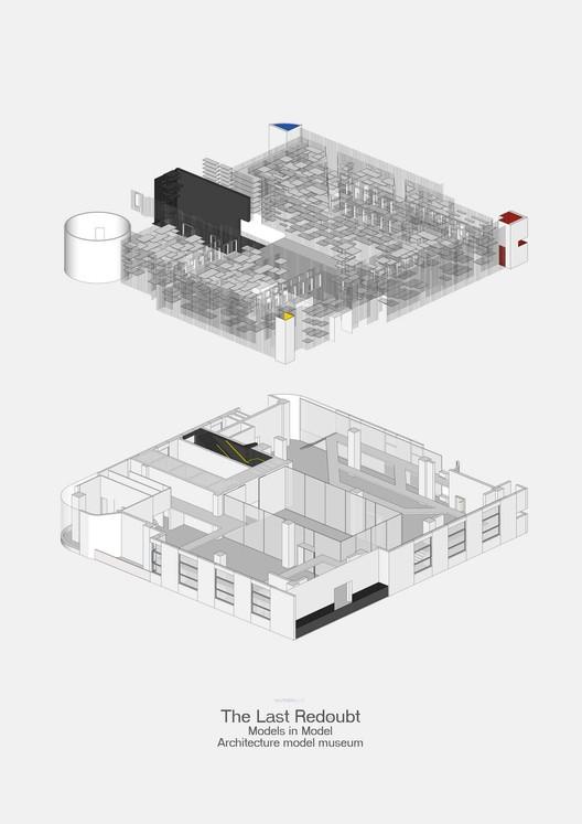 Last Redoubt同時具有人和模型的兩種尺度。在模型的尺度上,Last Redoubt有十幾層高,所有的模型承板都是懸挑焊接在圓桿上的。不同的模型坐落在不同高度上的承板上,它們同時塑造Last Redoubt的形態。在人的尺度上,博物館有個穿越各個展區的夾層。夾層是用懸吊的方式建造,吊桿一樣是直徑32mm的白色圓形鋼管。我把夾層隱藏在鋼管形成的界面中是為了避免在視覺上讓兩種尺度發生沖突。參觀者可以隱秘地穿行在模型之間來觀察模型。是作為博物館重要的體驗流線,同時它也是作為模型的Last Redoubt立體交通系統的一個部分。