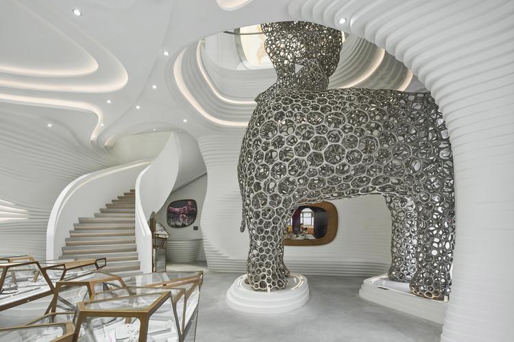 作為主體藝術(shù)形象的“太平有象“ 穿越室內(nèi)與室外,兩座神秘人物岳敏君的笑臉人像盤坐于象背之上,穿越一層和二層的“巖洞中心”空間,成為視覺設(shè)計(jì)的核心。“太平有象”總高9米,約9噸重,靈感來源于I Do 品牌鉆石的原子結(jié)構(gòu)晶格和其生物形態(tài)的有機(jī)本質(zhì)。象征意義上,大象和人物代表著智慧、力量和團(tuán)結(jié)的象征,折射出觀者與藝術(shù)家店的關(guān)系。“太平有象”這一世界獨(dú)創(chuàng)的藝術(shù)裝置,利用大規(guī)模3D打印脫蠟鑄造金屬工藝呈現(xiàn),由316L不銹鋼金屬鑄造而成。藝術(shù)裝置的設(shè)計(jì)創(chuàng)造了一個(gè)通透且高度結(jié)構(gòu)化的晶格,同時(shí)受到細(xì)胞生物學(xué)和鉆石原子結(jié)構(gòu)的啟發(fā)。符號(hào)化元素和尖端制造技術(shù)的統(tǒng)一,為建筑空間和藝術(shù)的創(chuàng)造提出了一條全新的道路。可謂當(dāng)代藝術(shù)設(shè)計(jì)與科技運(yùn)用于商業(yè)空間的一場(chǎng)完美巨獻(xiàn)。