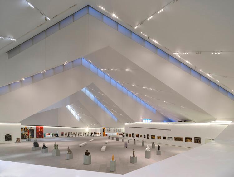建筑屋頂由四個相互連接的金字塔結構構成。這四個金字塔的高度逐級遞增,并朝文化廣場的四個角落展開。自然光線則通過每個金字塔頂端的屋頂流入室內。此外,屋頂的折線設計也直接呼應了建筑內的大跨度結構:造型與結構共同運作,為博物館打造了巨大的、靈活的無柱體量。同時,以中央大畫廊為核心,較小的展覽空間則環(huán)繞著建筑周邊布置。另外,屋頂覆有自然氧化的彎曲金屬鋼板,以此幫助整體進行排水,同時也為建筑表面打造了豐富的三維質感。這一面板的比例尺度正適合大規(guī)模的博物館,其線性排布也進一步地突出了金字塔形屋頂的形態(tài)。