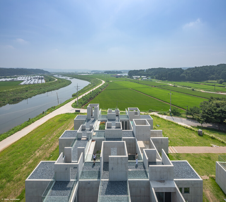 這一項目意在打造屬于當地的“村落”。韓國利川以大米及鮮花農場聞名,正在經歷著老齡化人口帶來的危機。這一城市需要尋求新生機,因此建筑師提出打造一個實驗型的跨文化設施,并在“跨空間”中打造多樣文化間的互動。