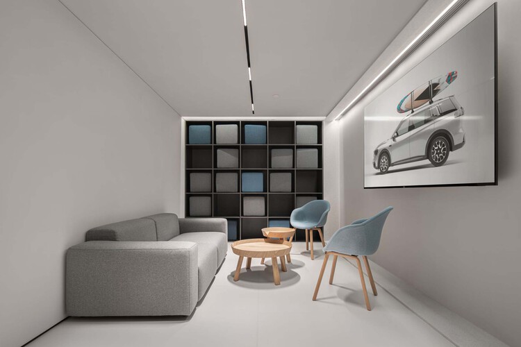 空間遞進,二層包含洽談間及水吧功能,我們強調材質選取對于內部空間延展的重要性,它使建筑物“非個體化”,金屬材質釋放沉靜穩定的情緒,形成具有鮮明特性的場域。在平滑墻面的另一側,隱藏著一面收納客椅多功能柜,根據使用場景靈活切換,前一刻收納,下一刻則變成小型的展示洽談會。幾何形凳子是基于功能的體驗,每一處都暗藏巧思,是這個空間不可或缺的移動元素。