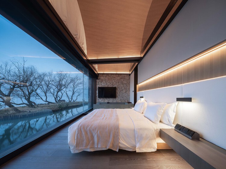 船塢民宿建筑整體由入口接待處、餐廳及客房三部分組成。 從入口進(jìn)入接待處的拱頂尺度最大,這一路徑指向水面,標(biāo)志著空間序列的序曲。其余兩個(gè)多向拱建筑體量分置于其兩側(cè),由庭院分割為前后兩部分,構(gòu)成了餐廳和客房等主要功能空間。在前往二層的路徑中,上行的步行體驗(yàn)與漸強(qiáng)符號(hào)般的屋頂,是遇見平原濕地廣闊畫卷的前奏。客房的屋頂也是由拱頂構(gòu)成,每一個(gè)拱頂都對(duì)應(yīng)一間客房。作為居住村落和自然風(fēng)景的交匯點(diǎn),在民宿的步行中,離城市日常漸遠(yuǎn),但離自然漸近。