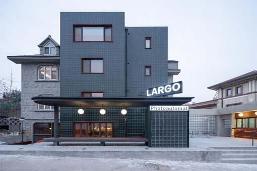 高速公路兩旁的店鋪斜對(duì)兩側(cè)車(chē)行方向,而Largo的店招雙向小區(qū)入口和內(nèi)庭院出口, 為隱蔽的地理位置提供明確的指引。結(jié)合品牌將出品的產(chǎn)品種類(lèi)和對(duì)將出現(xiàn)排隊(duì)現(xiàn)象的預(yù)估,前院的大頭貼棚提供多一種復(fù)古情懷服務(wù),同時(shí)也作為等位亭的結(jié)構(gòu)支撐。